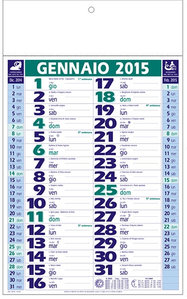 Calendario, verde e blu, mensile 12 fogli, carta patinata, allestimento termosaldato. ...